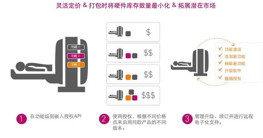 通過(guò)使用功能型許可和授權(quán)管理,醫(yī)療設(shè)備供應(yīng)商可以運(yùn)送帶有不同特征/功能的同一種物理硬件設(shè)備,以區(qū)分不同價(jià)格點(diǎn)的客戶。這還使他們可以遠(yuǎn)程升級(jí)或降級(jí)客戶,從而降低支持和實(shí)現(xiàn)的成本,并能夠提供更好的客戶體驗(yàn),這是真正的雙贏局面。
