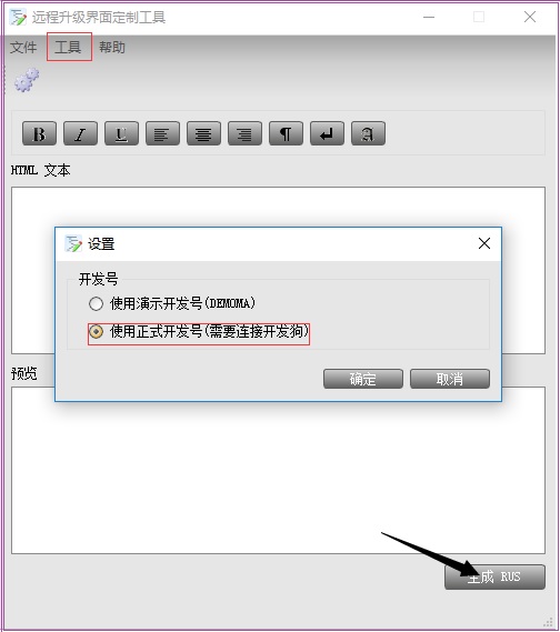 插上主鎖,在上面菜單的工具中選擇正式開發(fā)號(hào),點(diǎn)“生成RUS”會(huì)生成一個(gè)專用的遠(yuǎn)程升級(jí)工具。如果需要在界面中顯示一些特殊的信息,可以“HTML文本”中自行輸入。