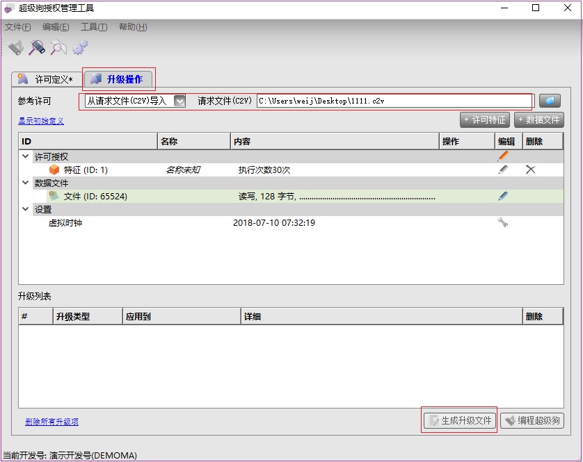 在升級(jí)操作界面,將用戶端傳來(lái)的c2v文件導(dǎo)入,導(dǎo)入后會(huì)看到界面中有關(guān)用戶端超級(jí)狗的詳細(xì)信息,對(duì)這些信息加以修改,如增加使用次數(shù)、延長(zhǎng)到期時(shí)間、修改存儲(chǔ)區(qū)數(shù)據(jù)等,全部設(shè)置完畢后,點(diǎn)擊“生成升級(jí)文件”,會(huì)產(chǎn)生一個(gè)擴(kuò)展名為v2c的升級(jí)激活文件,將此文件發(fā)給用戶。