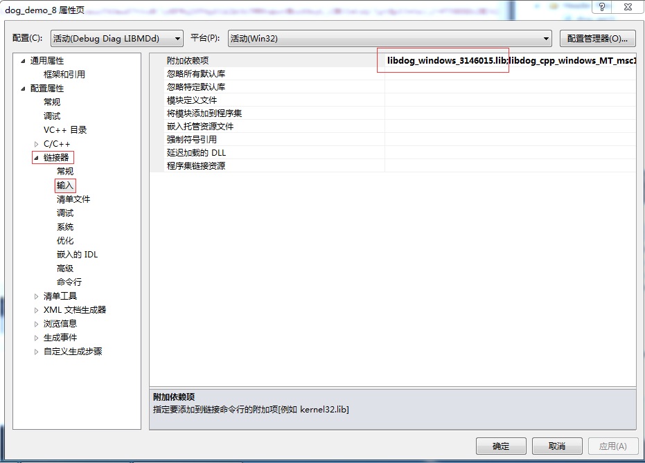用記事本打開正式號密鑰文件xxxxx.hvc,把內(nèi)容全部復(fù)制,找到示例目錄中的vendor_code.h文件,把hvc文件中的內(nèi)容替換到“unsigned char vendorCode[] =”后面的引號中,然后點(diǎn)擊“項目”-“屬性”,在"Link"的輸入項中添加依賴庫libdog_windows_x64_xxxxx.lib,并把原來的依賴庫libdog_windows_x64_demo.lib刪除,然后重新編譯生成即可。注意這個libdog_windows_x64_xxxxx.lib庫應(yīng)拷貝至工程文件所設(shè)置的依賴庫目錄列表中。