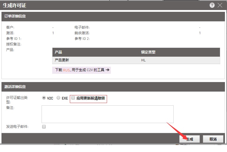 4、生成一個升級文件,可以選擇v2c或exe方式(v2c通過RUS工具升級,exe是直接運行升級,LDK9.0以后不再支持exe方式),如果升級時同時需要清除原加密鎖中的內(nèi)容,請勾選“應用更新前清除鎖”。