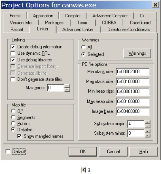 使用 Borland C++Builder 6 打開一個已有的 C++工程,在菜單欄中選擇: Project——Options,這將打開工程的 Project Options 對話框, 請選擇 Linker 選項卡,在 Map file 分組框中選擇選項:“Detailed” ,并勾選選項:“Show mangled names” (如圖 3),點擊確定按鈕,然后重新編譯整個工程, map 文件將與 exe 文件生成到同一目錄中。