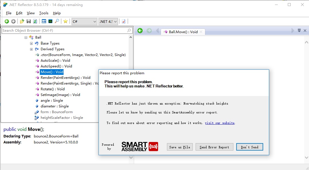 超級(jí)狗開(kāi)發(fā)包自帶的32位C# demo程序dot_NET2_bounce.exe,以其中的一個(gè)類(lèi)/方法move()作為測(cè)試內(nèi)容。