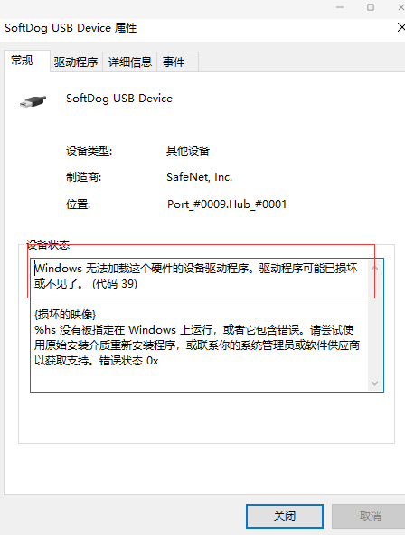 軟件狗、微狗和宏狗在win10環(huán)境中驅(qū)動(dòng)安裝成功,但在設(shè)備管理器中查看帶嘆號,點(diǎn)擊帶嘆號的設(shè)備,詳細(xì)頁面中有39錯(cuò)誤代碼,