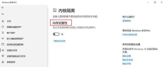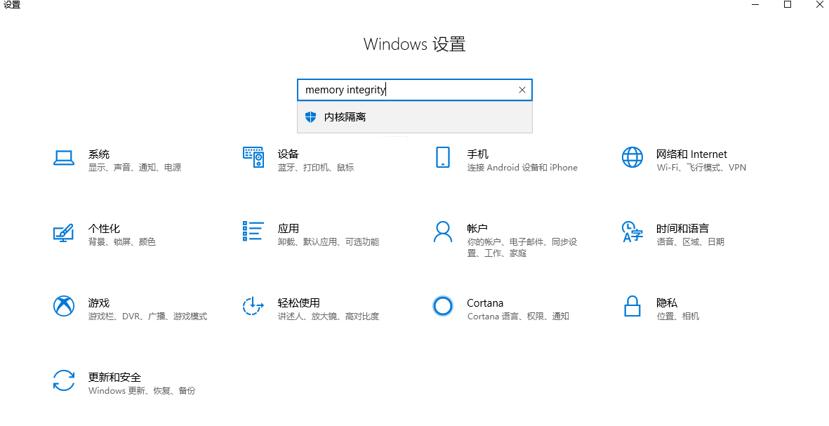 在win10的設(shè)置中,查找“memory integrity”或“內(nèi)核隔離”,