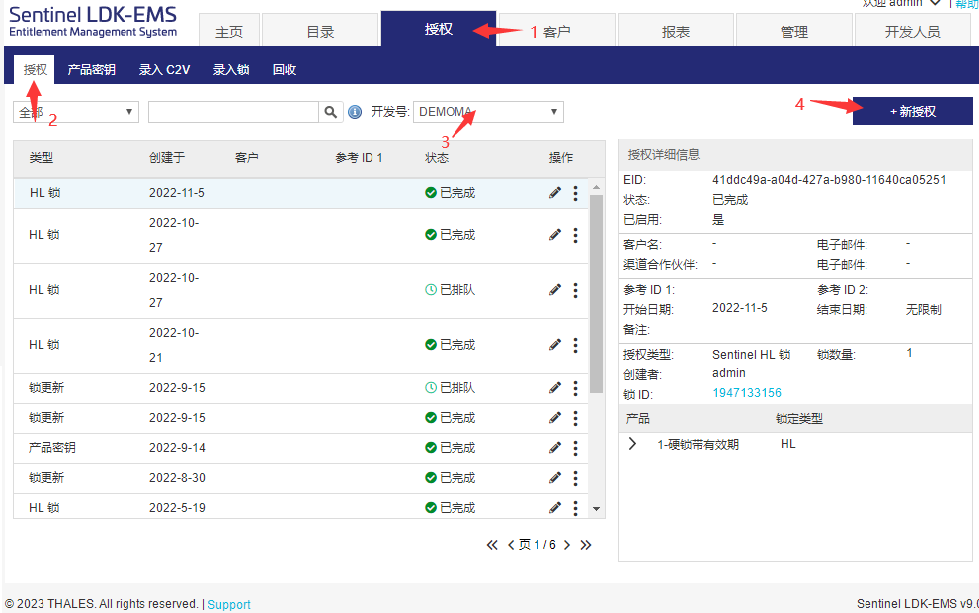 請按圖示步驟選擇1目錄,2授權,3開發(fā)號,4新授權,其中開發(fā)號是對應5個字母的主鎖開發(fā)號,測試用戶請選擇DEMOMA