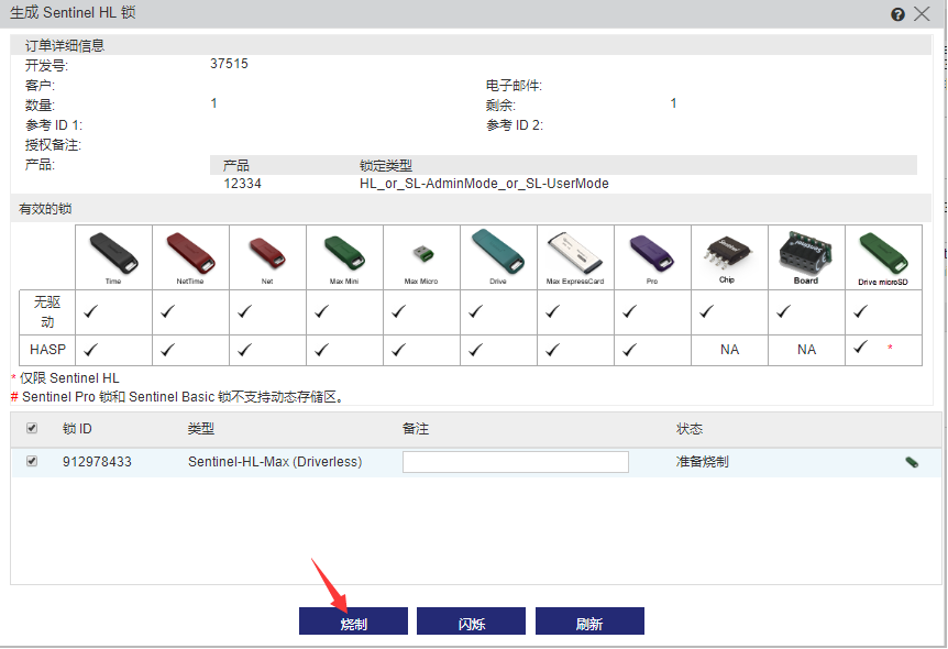 3、新建訂單、燒鎖---設置好要燒鎖的數(shù)量、對應的軟件產(chǎn)品,開始寫鎖。