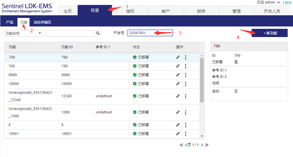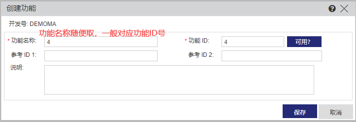 請按圖示步驟選擇1目錄,2功能,3開發(fā)號,4新建功能,其中開發(fā)號是對應5個字母的主鎖開發(fā)號,測試用戶請選擇DEMOMA