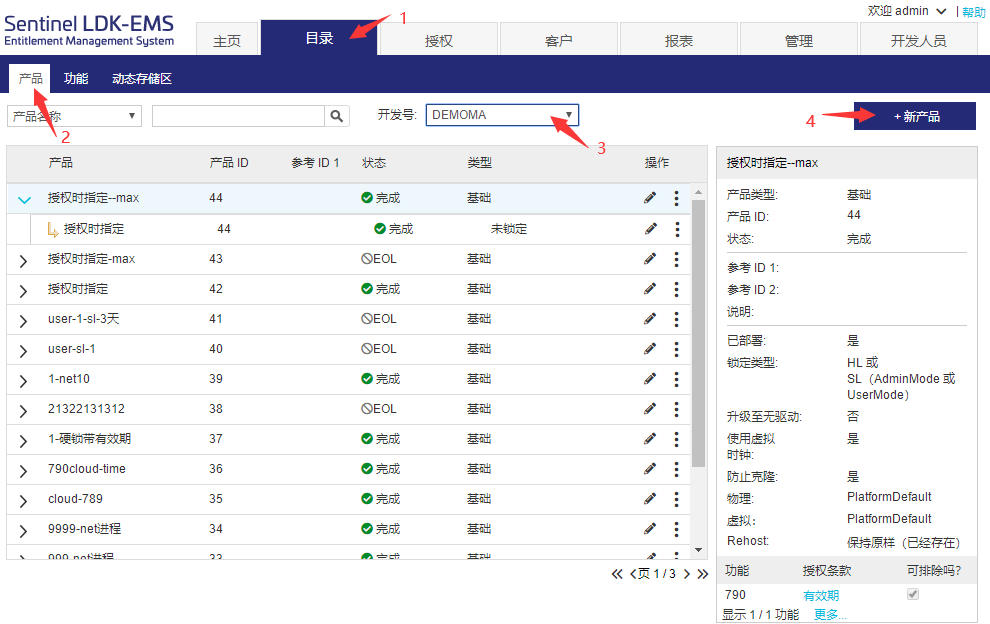 請按圖示步驟選擇1目錄,2產(chǎn)品,3開發(fā)號,4新建產(chǎn)品,其中開發(fā)號是對應5個字母的主鎖開發(fā)號,測試用戶請選擇DEMOMA