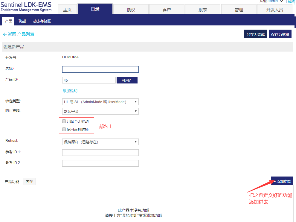 “功能名稱”隨便取,一般與功能ID號一致,“功能ID”要對應外殼加密時所使用的功能ID號或函數(shù)調(diào)用時的login的feature ID參數(shù)。