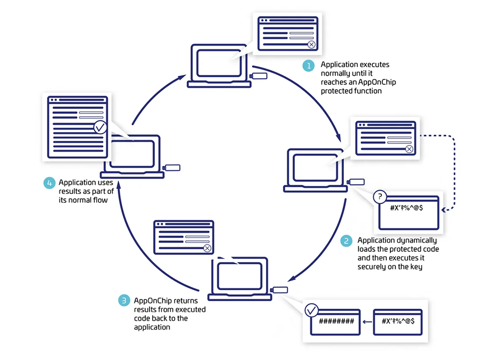 在運(yùn)行時(shí),受保護(hù)的應(yīng)用程序?qū)⒓用艽a上傳到硬件密鑰,在密鑰中解密并安全執(zhí)行,避免調(diào)試器等破解工具的攻擊。