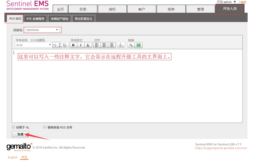 登錄EMS,在“開發(fā)人員”界面,選“RUS標記”,選擇自己的主鎖開發(fā)號,填入適當?shù)淖⑨屛淖郑ㄒ部梢圆惶睿?,左下角點生成,系統(tǒng)會生成一個“RUS”開頭的exe文件。
